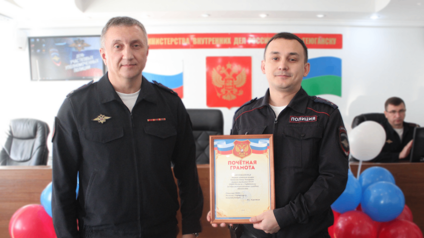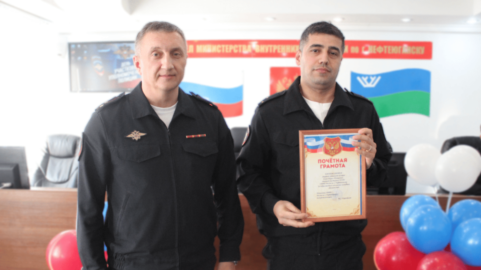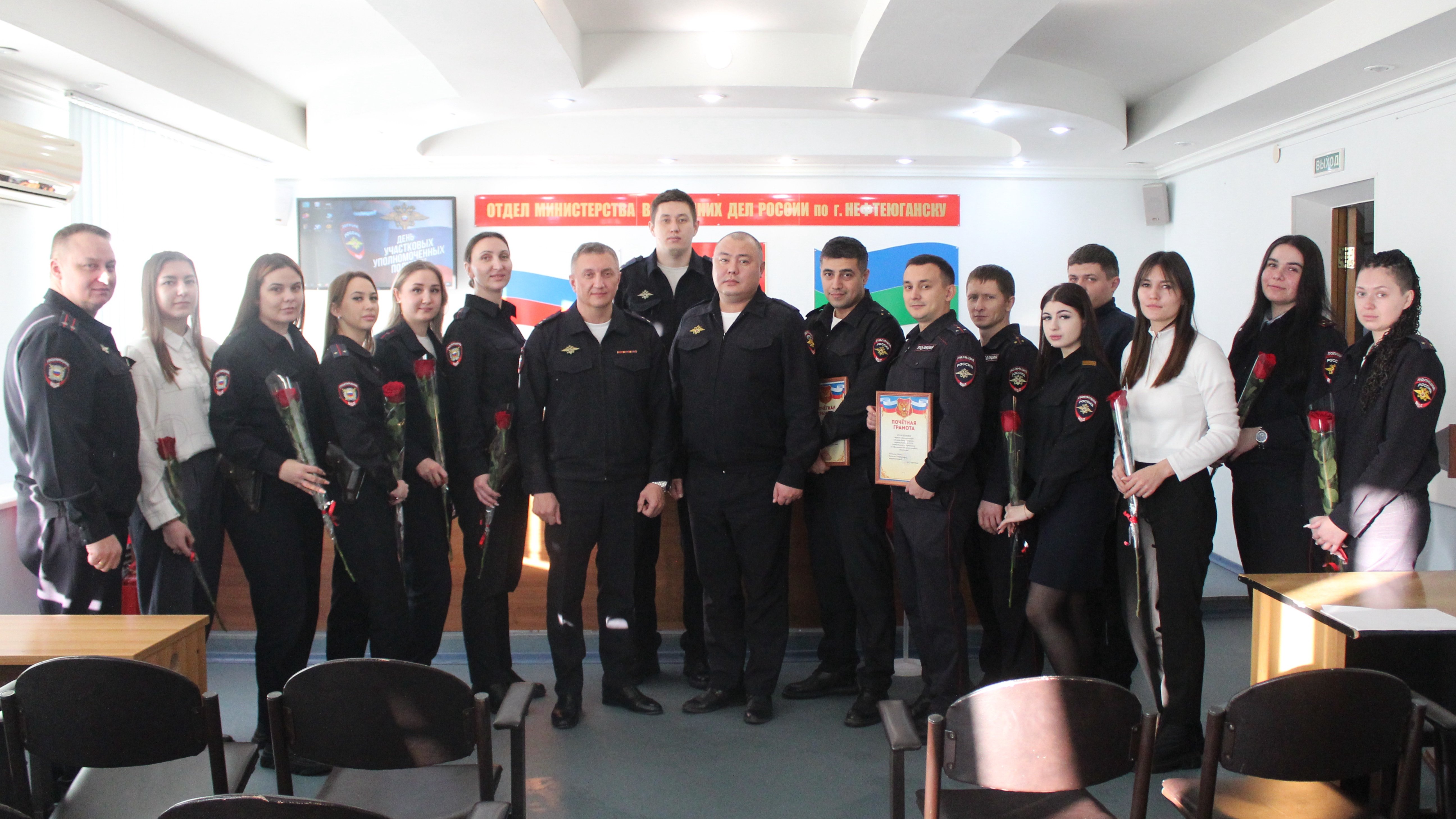 Пресс-релизы| -- Архив за 2010 год| -- Архив за 2011 год | -- Архив за 2012 год | -- Архив за 2013 год | -- Архив за 2014 год | -- Архив за 2015 год | -- Архив за 2016 год | -- Архив за 2017 год | -- Архив за 2018 год | -- Архив за 2019 год Информация раздела предоставлена пресс-службой ОМВД России по городу Нефтеюганску. Телефон: 29-59-29 Участковых уполномоченных полиции ОМВД России по городу Нефтеюганску поздравили с профессиональным праздником. Сегодня прошло торжественное собрание, посвященное 102-ой годовщине образования подразделений участковых уполномоченных МВД России. Начальник Отдела Максим Коростелев поздравил личный состав, отметив важную роль участковых уполномоченных полиции в жизни города: «Ваша роль в обеспечении общественного порядка исключительно высока. Вы ближе всех находитесь к населению, первыми встречаетесь с человеческой бедой, первыми принимаете сигналы о помощи. Благодарю личный состав за службу и примерное отношение к выполнению служебного долга», – отметил полковник полиции. За добросовестное исполнение служебных обязанностей отличившимся сотрудникам объявлены благодарности, почетные грамоты вручили старшим участковым уполномоченным полиции Туралу Алиеву и Динару Кангаслину.