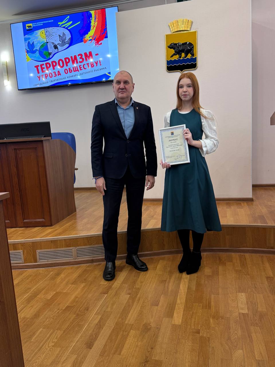 В ходе итогового заседания Антитеррористической комиссии состоялось награждение победителей творческого конкурса детского рисунка «Терроризм - угроза обществу!» среди учащихся и воспитанников учреждений образования. Цель Конкурса - формирование среди детей, подростков и молодежи негативного отношения к идеям терроризма в рамках реализации государственной политики в области профилактики терроризма в Российской Федерации. В финал конкурса вышли 69 работ, из которых определены 22 победителей по трем возрастным категориям. По итогам рассмотрения конкурсных работ, путем простого арифметического суммирования оценок победителями стали: