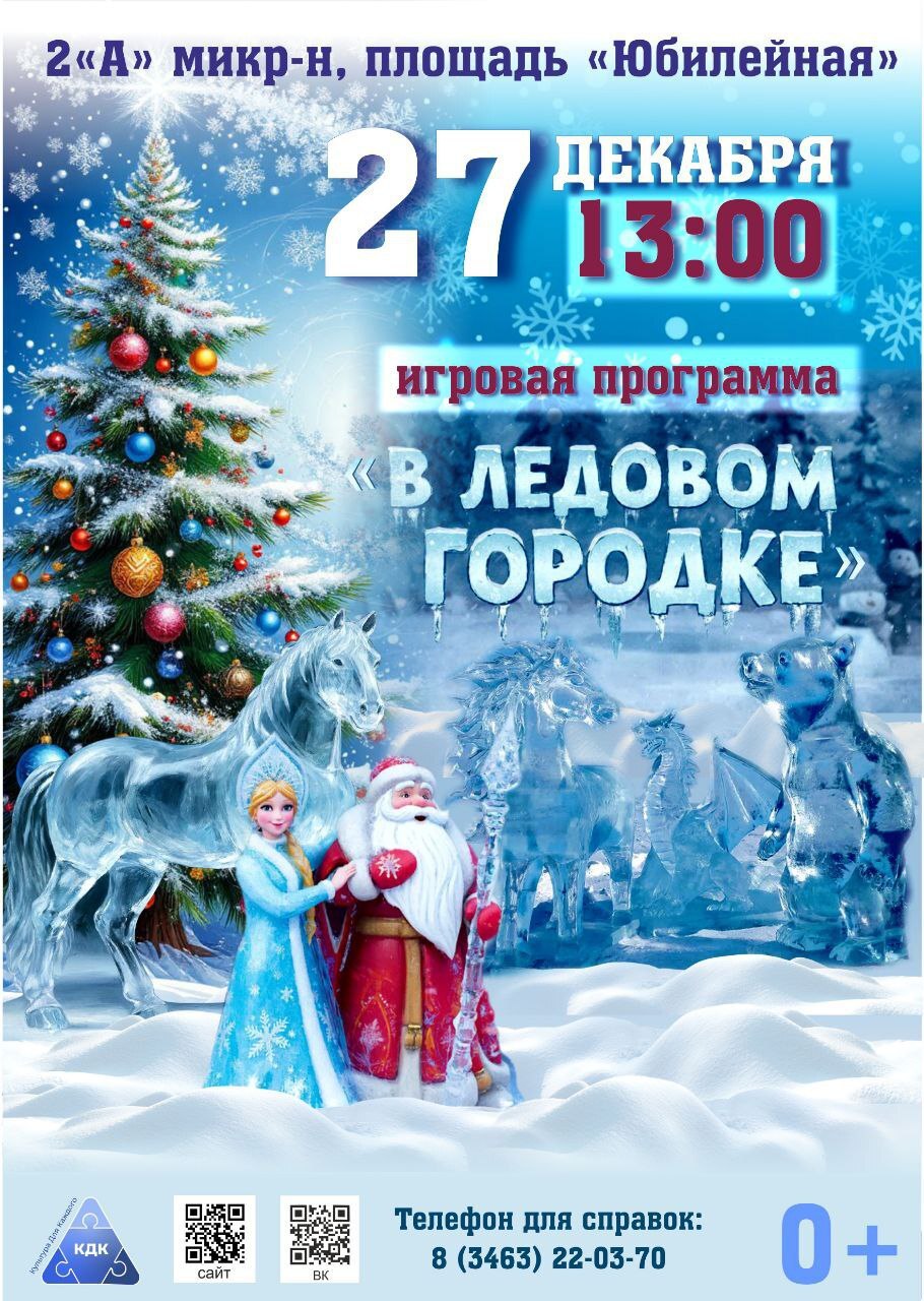Уважаемые горожане и гости нашего города! Приглашаем вас на игровую программу «В ледовом городке» с участием артистов! Когда: 27 декабря 2025 года, начало в 13:00 Будет весело, ярко и по-зимнему празднично! | |||||